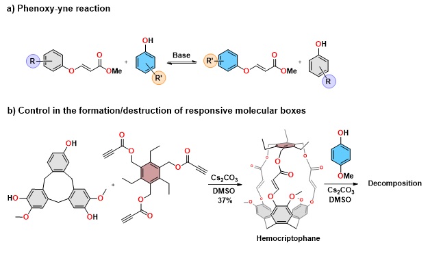 In these systems, the pKa difference between the phenols governs the exchange dynamic and sets the equilibrium thermodynamic. The reaction has been validated in the arena of supramolecular chemistry, in which complex architectures such as responsive molecular boxes occupy a relevant place. As an example, the molecular box hemocryptophan was chosen, which presents good thermodynamic stability and is synthesized in a single step using the hydroxyl-yne reaction shown in the Figure. The box, once formed, decomposes in the presence of an excess of p-methoxyphenol using the same reaction conditions of its formation, which confirms the potential of this chemistry to control the construction/destruction of molecular systems with phenolic components.