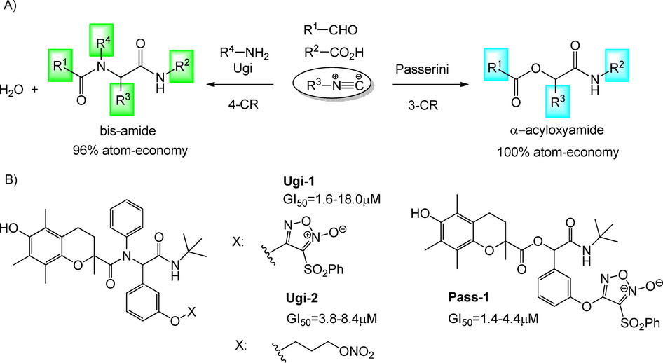 Cancer is the second leading cause of death worldwide. Herein, a strategy to quickly and efficiently identify novel lead compounds to develop anticancer agents, using green multicomponent reactions followed by antiproliferative activity and structure–activity relationship studies, is described. A second-generation focused library of nitric oxide-releasing compounds was prepared by microwave-assisted Passerini and Ugi reactions. Nearly all compounds displayed potent antiproliferative activities against a panel of human solid tumor cell lines, with 1-phenyl-1-[(tert-butylamino)carbonyl]methyl 3-[(3-phenylsulfonyl-[1,2,5]oxadiazol-4-yl N-oxide)oxy]benzoate (4 k) and N-[1-(tert-butylaminocarbonyl)-1-phenylmethyl]-N-(4-methylphenyl)-3-(3-phenylsulfonyl-[1,2,5]oxadiazol-4-yl N-oxide)oxyphenyl carboxamide (6 d) exhibiting the strongest activity on SW1573 lung cell line (GI=110 and 21 nm) with selectivity indices of 70 and 470, respectively. Preliminary mechanistic studies suggest a relationship between NO release and antiproliferative activity. Our strategy allowed the rapid identification of at least two molecules as future candidates for the development of potent antitumor drugs