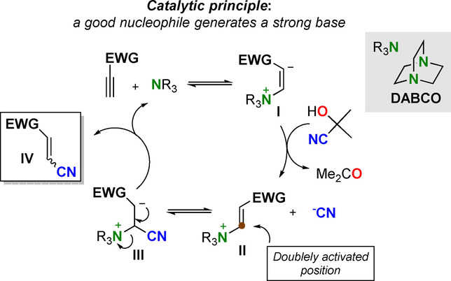 A universal, practical and scalable organocatalytic hydrocyanation manifold to provide ß¿substituted acrylonitriles bearing an electron¿withdrawing functionality has been implemented. The catalytic manifold operates under the reactivity generation principle ¿a good nucleophile generates a strong base¿, and it uses 1,4¿diazabicyclo[2.2.2]octane (DABCO) as the catalyst, activated terminal alkynes as substrates and acetone cyanohydrin as the cyanide source. The acrylonitriles obtained as E,Z mixtures are straightforwardly resolved by simple flash chromatography delivering the pure isomers in preparative amounts.