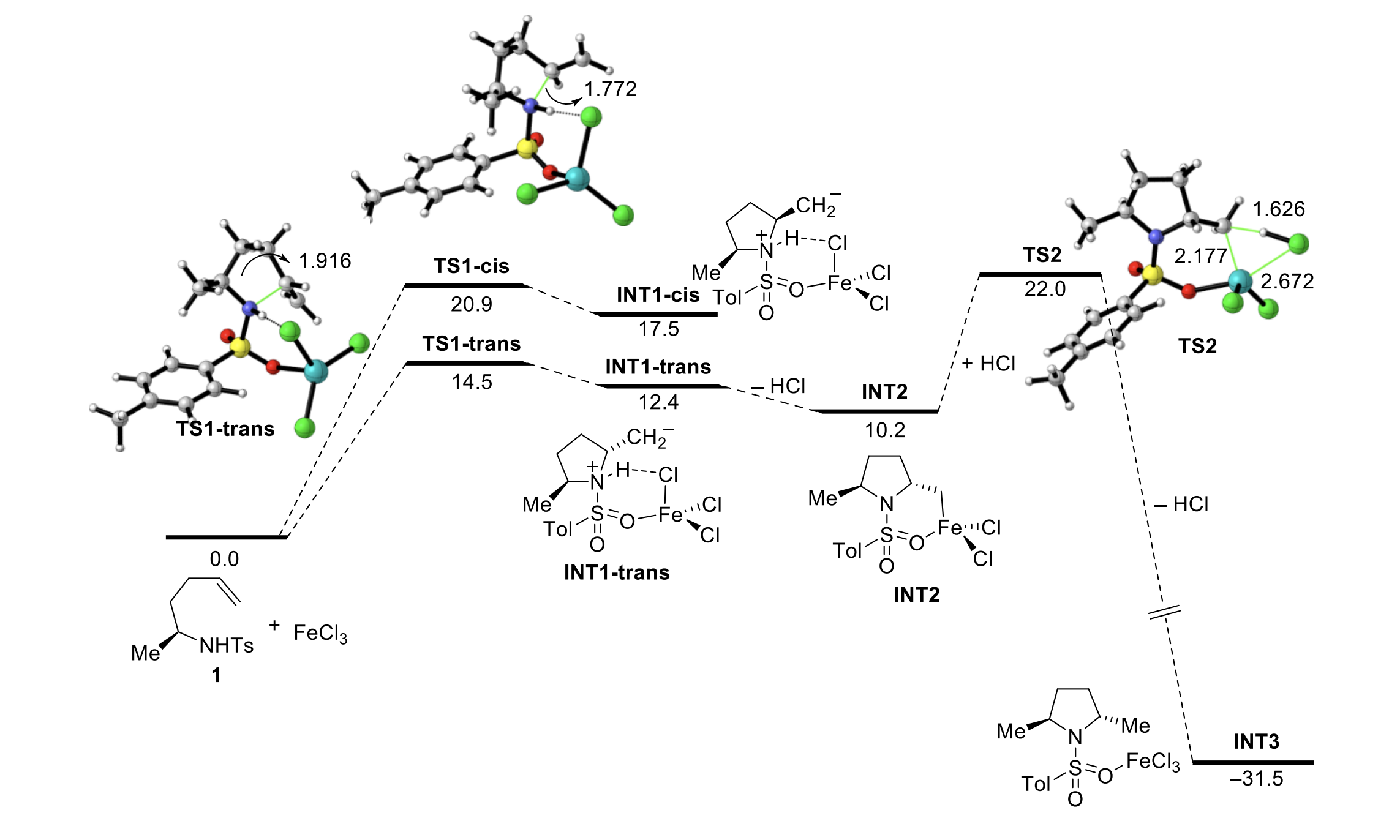 A highly efficient, diastereoselective, iron(III)‐catalyzed intramolecular hydroamination/cyclization reaction involving α‐substituted amino alkenes is described. Thus, enantiopure trans‐2,5‐disubstituted pyrrolidines and trans‐5‐substituted proline derivatives were synthesized by means of a combination of enantiopure starting materials, easily available from l‐α‐amino acids, with sustainable metal catalysts such as iron(III) salts. The scope of this methodology is highlighted in an enantiodivergent approach to the synthesis of both (+)‐ and (−)‐pyrrolidine 197B alkaloids from l‐glutamic acid. In addition, a computational study was carried out to gain insight into the complete diastereoselectivity of the transformation.