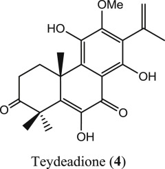 A phytochemical study of an extract from transformed root cultures of Nepeta teydea, induced by Agrobacterium rhizogenes, led to the isolation of the following new compounds: the sesquiterpene (-)-cinalbicol, the diterpene teydeadione (6,11,14-trihydroxy-12-methoxy-abieta-5,8,11,13,15-penten-7-one), a degraded C23-triterpene (teydealdehyde) and three fatty acid esters of lanosta-7,24-dien-3β-ol. The propyl ester of rosmarinic acid was also isolated for the first time from a natural source. In addition, two dehydroabietane diterpenes, eight triterpenes and eighteen known phenolic compounds were obtained. The antifeedant, cytotoxic and phytotoxic activities of the isolated compounds have also been investigated.