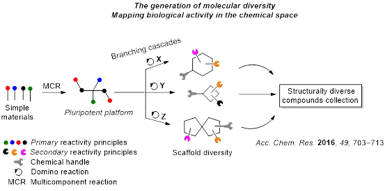 • The design of new domino processes (cascade) for the generation of chemical complexity from simple molecular platforms (preferably linear), easily accessible (preferably commercially available or quickly assembled) and endowed with a polyvalent reactivity profile (multiple and diverse). We call them pluripotent platforms by association with the biological concept of pluripotency. Instrumental simplicity and scaling up are our main design criteria.