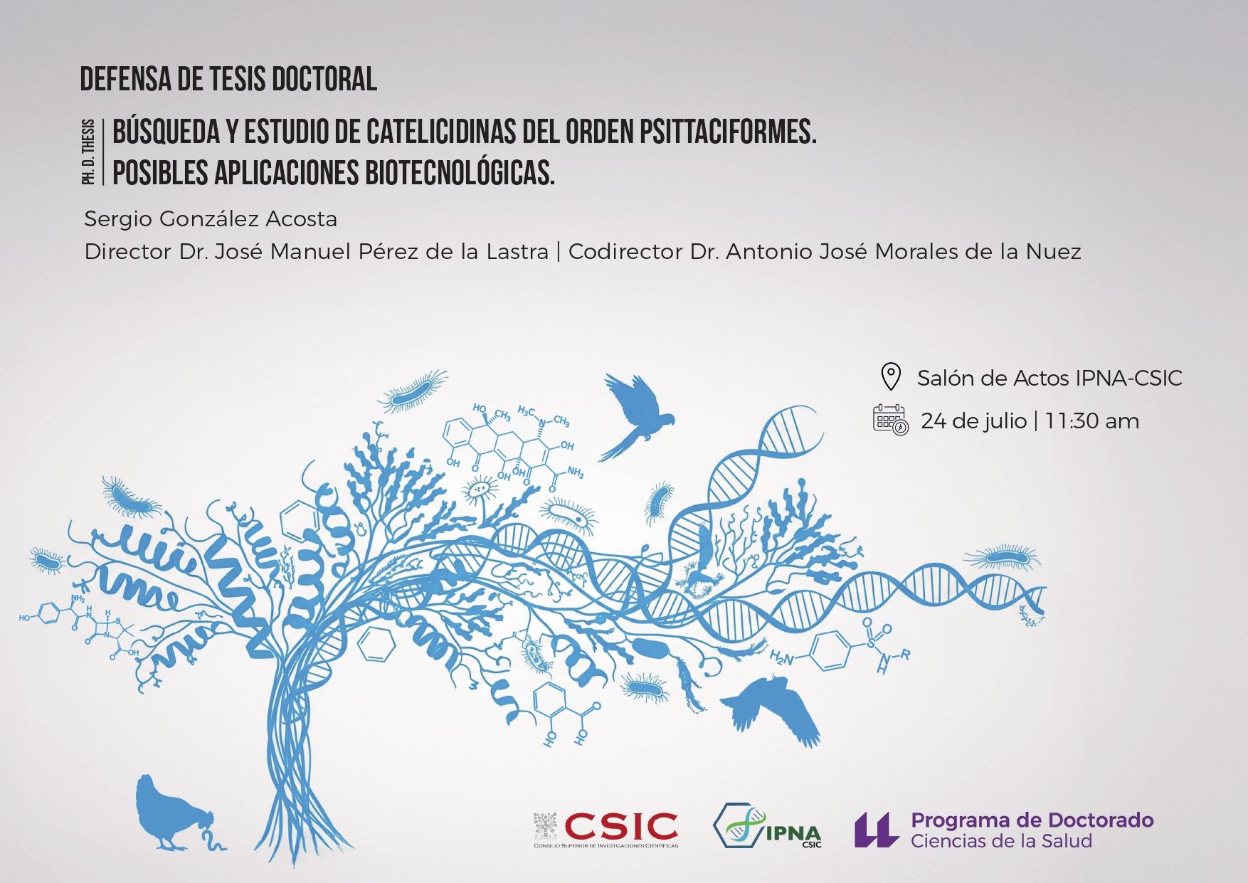 El próximo jueves, 24 de julio, nuestro compañero Sergio González Acosta procederá, a partir de las 11.30 horas, a defender su tesis doctoral que lleva por título Búsqueda y estudio de catelicidinas del orden psittaciformes. Posibles aplicaciones biotecnológicas. Su tesis ha sido dirigida por José Manuel Pérez de la Lastra y codirigida por Antonio José Morales de la Nuez. La defensa será en el salón de actos del IPNA-CSIC.