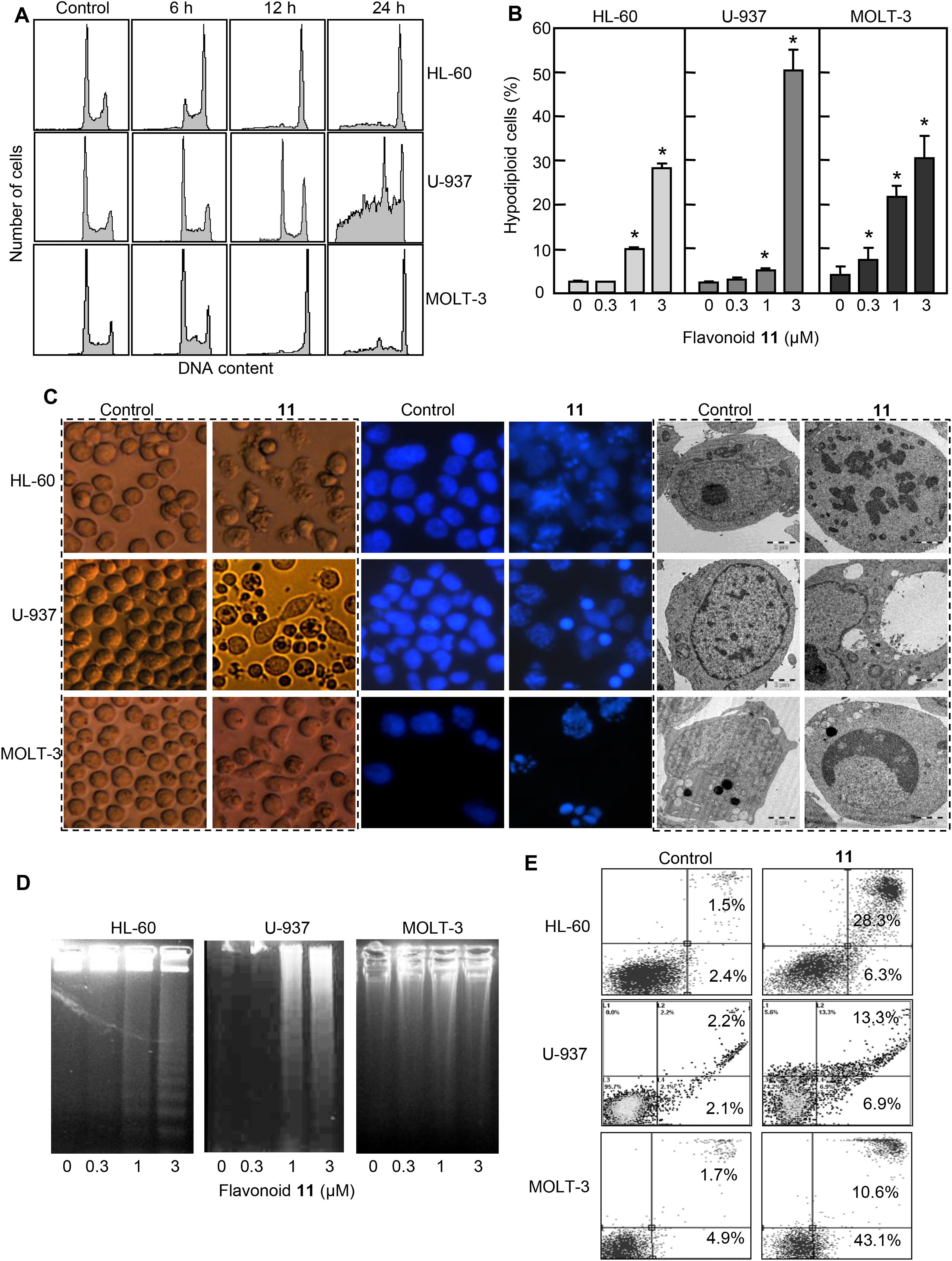 Flavonoids are phenolic substances that appear to exert beneficial effects in several chronic diseases, including cancer. Structure-activity relationships of the cytotoxic activity of a series of flavonols and their 3-methyl ether derivatives established that 3′-hydroxy-3,4′-dimethoxyflavone (flavonoid 11) displayed strong cytotoxicity against human leukaemia cell lines (HL-60, U-937 and MOLT-3), and cells that over-express the anti-apoptotic proteins, Bcl-2 and Bcl-x, and against P-glycoprotein-overexpressing K-562/ADR cells. This compound induced G-M cell cycle arrest and it was a potent apoptotic inducer on HL-60, MOLT-3, U-937 and U-937/Bcl-2 cell lines. Cell death was (i) mediated by caspase activation, since it was prevented by the non-specific caspase inhibitor z-VAD-fmk and reduced by a selective caspase-9 inhibitor, (ii) associated with cytochrome c release, the dissipation of the inner mitochondrial membrane potential (ΔΨ) and the activation of the mitogen-activated protein kinase pathway and (iii) partially blocked by the inhibition of c-jun NH terminal kinases/stress activated protein kinases (JNK/SAPK) signalling and by the free-radical scavenger N-acetyl-L-cysteine.