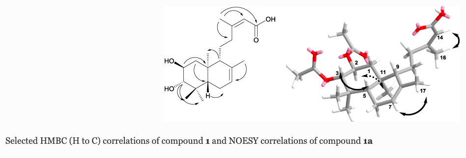 Study of the aerial parts of the two species of Ageratina: A. dictyoneura and A. illita afforded four new ent-labdane diterpenoids (1–4). Two known labdanes: 2β,3α,15-trihydroxy-ent-labd-7-ene (5), and 2β,3α-trihydroxy-ent-labd-7-en-15-oic acid (6); two sesquiterpene lactones: 8β-hydroxy-β-cyclocostunolide (7) and eupatoriopicrin (8), one benzofuran, and six flavonoids were also isolated. Their chemical structures were determined based on extensive spectroscopic study, comparison with reported data and chemical transformations. The cytotoxicity of the new ent-labdane diterpenoids 1–3, sesquiterpene lactone 7, and the flavonoid: quercetin 3,7-dimethylether were assessed against the human myeloid leukemia U-937 cell line and found that compound 7 and quercetin 3,7-dimethylether were cytotoxic against this cell line.