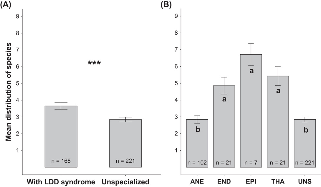 Oceanic islands emerge lifeless from the seafloor and are separated from continents by long stretches of sea. Consequently, all their species had to overcome this stringent dispersal filter, making these islands ideal systems to study the biogeographic implications of long-distance dispersal (LDD). It has long been established that the capacity of plants to reach new islands is determined by specific traits of their diaspores, historically called dispersal syndromes. However, recent work has questioned to what extent such dispersal-related traits effectively influence plant distribution between islands. Here we evaluated whether plants bearing dispersal syndromes related to LDD ¿ i.e. anemochorous (structures that favour wind dispersal), thalassochorous (sea dispersal), endozoochorous (internal animal dispersal) and epizoochorous (external animal dispersal) syndromes ¿ occupy a greater number of islands than those with unspecialized diaspores by virtue of their increased dispersal ability. We focused on the native flora of the lowland xeric communities of the Canary Islands (531 species) and on the archipelago distribution of the species. We controlled for several key factors likely to affect the role of LDD syndromes in inter-island colonization, namely: island geodynamic history, colonization time and phylogenetic relationships among species. Our results clearly show that species bearing LDD syndromes have a wider distribution than species with unspecialized diaspores.