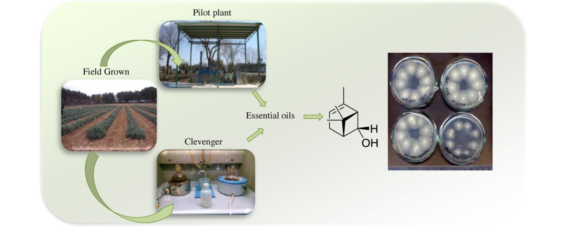 The objective of this study was the characterization and valorization of the essential oil from a domesticated Artemisia absinthium population (Teruel, Spain), and its comparison with another one (Sierra Nevada, Spain) undergoing the domestication process. These populations are being experimentally cultivated in the same field since 2008. We studied their biomass and essential oil production (Clevenger hydrodistillation, HD and semi-industrial vapor-pressure, VP). The domesticated population showed lower chemical variation and higher biomass and essential oil yields, allowing for the registration of a new plant variety. The observed variations in oil composition (HD, VP) between the two populations were mostly quantitative. The oils were characterized by the presence of cis-epoxyocimene, (-)-. cis-chrysanthenol, chrysanthenyl acetate, linalool and trans-caryophyllene. The insect antifeedant (. Leptinotarsa decemlineata, Spodoptera littoralis, Myzus persicae and Rhopalosiphum padi) and antifungal (. Fusarium spp. and Botrytis cinerea) effects of their oils were also tested. All VP extracts showed strong antifungal effects and the active antifungal compounds have been identified.