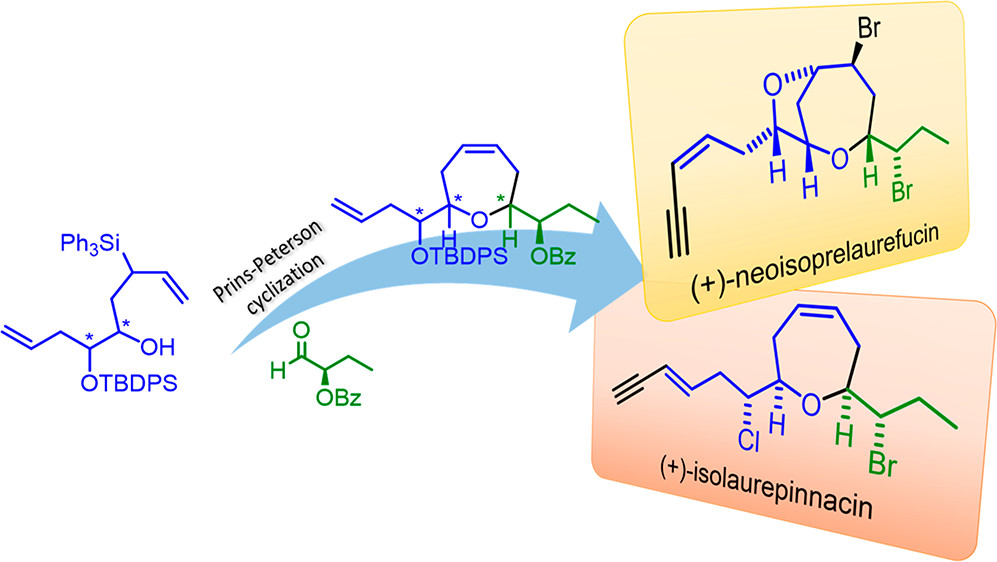 The shortest enantioselective total syntheses of (+)-isolaurepinnacin and (+)-neoisoprelaurefucin have been accomplished. These syntheses were based on a common parallel synthetic strategy using Prins–Peterson cyclization in their core construction. In only one step, a seven-membered ring oxacycle with the correct cis-stereochemistry ring closure and the Δ4 position of the endocyclic double bond in (+)-isolaurepinnacin was obtained. This unsaturation was also necessary to accede to the bromodioxabicycle on (+)-neoisoprelaurefucin.