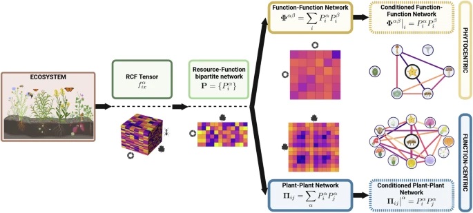 Understanding how biotic interactions shape ecosystems and impact their functioning, resilience and biodiversity has been a sustained research priority in ecology. Yet, traditional assessments of ecological complexity typically focus on species-species interactions that mediate a particular function (e.g., pollination), overlooking both the synergistic effect that multiple functions might develop as well as the resulting species-function participation patterns that emerge in ecosystems that harbor multiple ecological functions. Here we propose a mathematical framework that integrates various types of biotic interactions observed between different species. Its application to recently collected data of an islet ecosystem—reporting 1537 interactions between 691 plants, animals and fungi across six different functions (pollination, herbivory, seed dispersal, decomposition, nutrient uptake, and fungal pathogenicity)—unveils a non-random, nested structure in the way plant species participate across different functions. The framework further allows us to identify a ranking of species and functions, where woody shrubs and fungal decomposition emerge as keystone actors whose removal have a larger-than-random effect on secondary extinctions. The dual insight—from species and functional perspectives—offered by the framework opens the door to a richer quantification of ecosystem complexity and to better calibrate the influence of multifunctionality on ecosystem functioning and biodiversity.