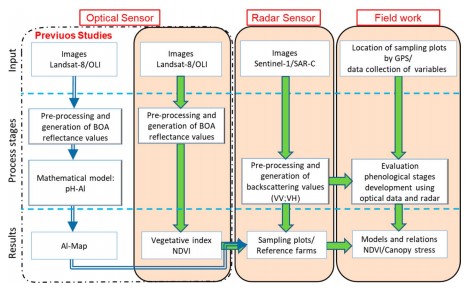 Under toxic aluminum (Al) levels in the soil, wheat (Triticum aestivum L.) sufers stress and plant growth is afected. A method for diagnosis of plants is proposed that includes the following as a strategy: to analyze total Al in the soil, employ satellite radar imagery and calculate a vegetation index. The objective of this research, conducted at the feld scale, was to explore how radar backscattering coefcients from a winter wheat canopy, combined with the normalized diference vegetation index (NDVI) and geographic information system (GIS) technology, can be used as a mapping tool for the variability of Al-stressed canopies. As a result, an analysis of covariance showed signifcant diferences, and the lowest plant height was obtained at a high level of soil Al, as well as the minimum grain weight and magnesium content. It was found that a simple model could be used to estimate plant height from the backscattering coefcient of vertical transmit-vertical receive polarization (σ°VV), with a strong correlation (r−0.84). In turn, a third-order polynomial regression model (R20.70) was proposed to estimate the NDVI from σ°VV. This model provided a good estimate of the NDVI at the stem elongation stage of growth (50 days after sowing). Detected NDVI patterns were associated with variation in canopy stress depending on polarimetric information, which, in turn, was related to soil Al levels. Thus, the maps derived from the model can monitor spatial variability, where NDVI values<0.68 indicate stressed areas. This study provides guidance for in-season stress spatial variability caused by Al.