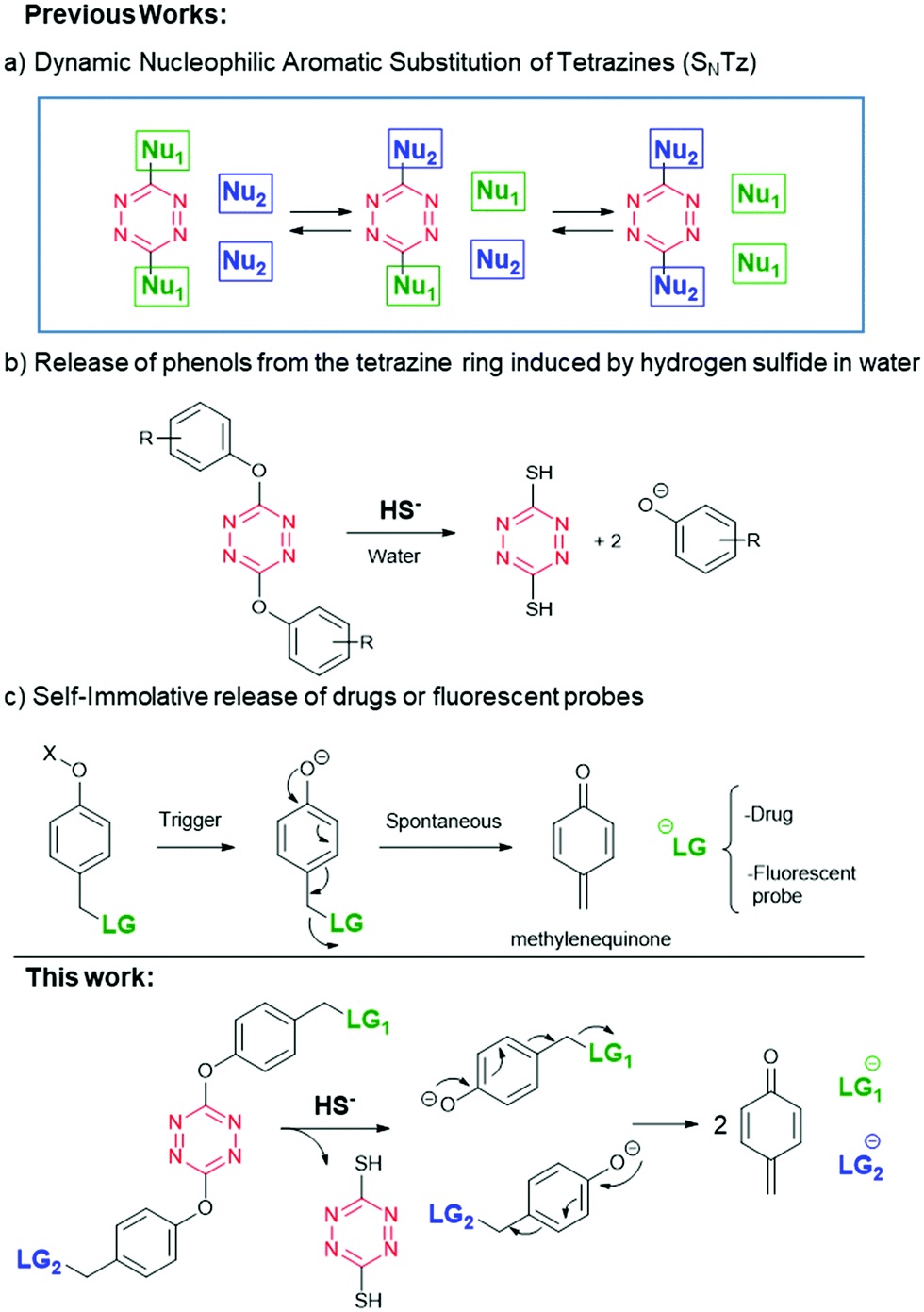 Dynamic nucleophilic aromatic substitution of tetrazines (SNTz) has been employed to build theranostic prodrugs that are activated by hydrogen sulfide. H2S is typically found in high concentrations in some kinds of cancer cells and it is able to trigger the disassembly of tetrazine prodrugs. In such a way, a dual release of drugs and/or fluorescent compounds can be selectively triggered.