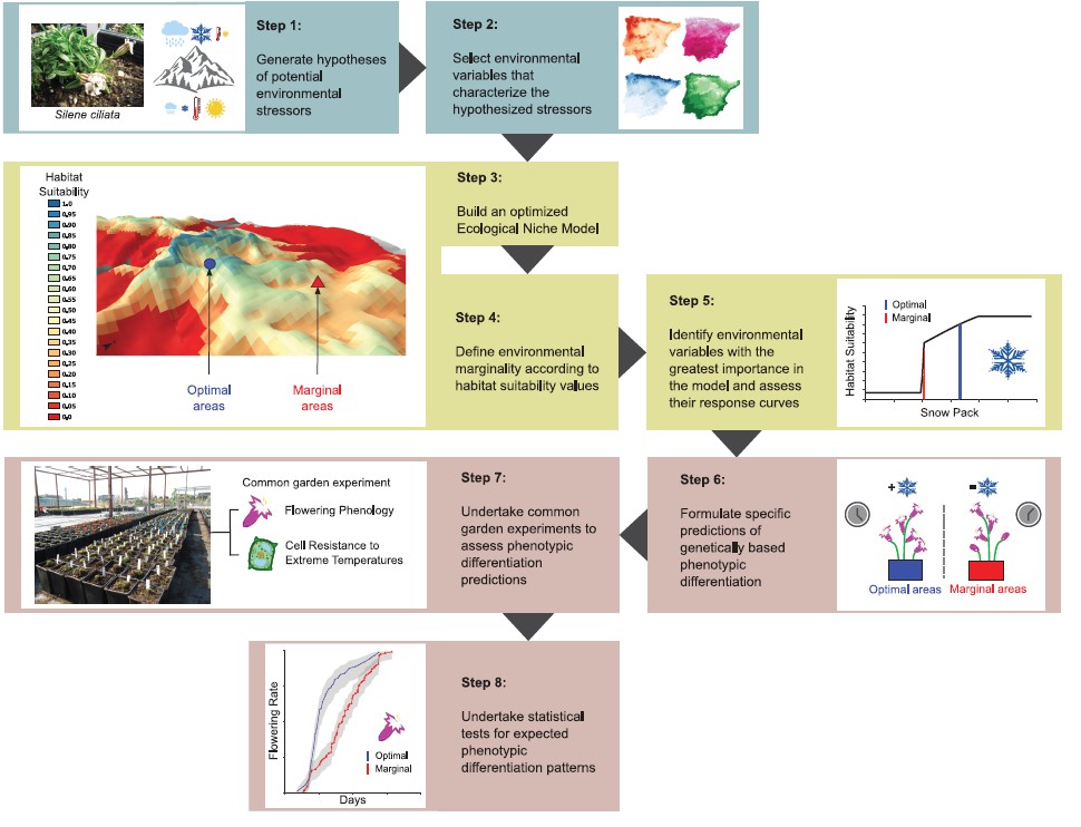 Environmental variation within a species’ range can create contrasting selective pressures, leading to divergent selection and novel adaptations. The conservation value of populations inhabiting environmentally marginal areas remains in debate and is closely related to the adaptive potential in changing environments. Strong selection caused by stressful conditions may generate novel adaptations, conferring these populations distinct evolutionary potential and high conservation value under climate change. On the other hand, environmentally marginal populations may be genetically depauperate, with little potential for new adaptations to emerge. Here, we explored the use of ecological niche models (ENMs) linked with common garden experiments to predict and test for genetically determined phenotypic differentiation related to contrasting environmental conditions. To do so, we built an ENM for the alpine plant Silene ciliata in central Spain and conducted common garden experiments, assessing flowering phenology changes and differences in leaf cell resistance to extreme temperatures. The suitability patterns and response curves of the ENM led to the predictions that: (1) the environmentally marginal populations experiencing less snowpack and higher minimum temperatures would have delayed flowering to avoid risks of late-spring frosts and (2) those with higher minimum temperatures and greater potential evapotranspiration would show enhanced cell resistance to high temperatures to deal with physiological stress related to desiccation and heat. The common garden experiments revealed the expected genetically based phenotypic differentiation in flowering phenology. In contrast, they did not show the expected differentiation for cell resistance, but these latter experiments had high variance and hence lower statistical power. The results highlight ENMs as useful tools to identify contrasting putative selective pressures across species ranges. Linking ENMs with common garden experiments provides a theoretically justified and practical way to study adaptive processes, including insights regarding the conservation value of populations inhabiting environmentally marginal areas under ongoing climate change.