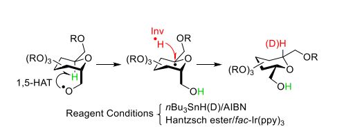 A simple epimerization of C-(α-D-Gly p )methanol into C-(β-L-Gly p )methanol compounds is described. The radical sequence involved homolytic cleavage of the C5–H bond by 1,5-hydrogen atom transfer promoted by the 1’-O-yl radical and subsequent hydride addition with inversion of configuration. This methodology allows the preparation of rare C-(β-L-Ido p )-, C-(β-L-Altp)-, C-(β-L-Gulp)-, C-(β-L-Allp)methanol glycosides starting from carbohydrates of the D-series. It can also be applied to transform L- into D-configured C-glycosyl compounds, as illustrated by the formation of C-(β-D-6dGulp)- and C-(β-D-6dAltp)methanol from readily accessible L-rhamno and L-fuco analogs, respectively. In further development of this procedure compounds with C-(β-L-Araf)- and C-(β-L-5dRibf)methanol structures have also been synthesized. The alkoxyl radicals were generated by reaction of the corresponding N-alkoxyphthalimides with nBu3SnH(D) and in comparative terms, by visible light-photocatalysis using the Hantzsch ester/fac-Ir(ppy)3 procedure. The influence of the sugar ring conformation and the electronegativity of the substituents on the stereochemical outcome will be addressed.