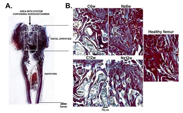 Norzoanthamine (NZ), an alkaloid that has been isolated from the marine cnidiaria Zoanthus sp., has been shown an interesting anti-osteoporotic activity. Although its mechanism of action is not yet clear, it seems that it is different from those of currently used drugs making it particularly interesting. Previous studies have been carried out mostly in vitro. Herein, we present an in vivo study that allows to check the real potential of NZ as a protector substance by direct application into ovariectomized rat bone using a sustained delivery system. Histological and histomorphometric results in ovariectomized rats showed higher bone quality as a result of greater number of trabeculae and osteogenic activity in the group implanted with NZ, compared to controls. In contrast with the untreated controls, NZ-treated groups showed a balanced osteoblast/osteoclast number ratio, similar to that found in the normal bone. These results suggest that NZ could be useful as adjunct to other osteoporosis treatments, but probably its main therapeutic role would be as preventive therapy against bone deterioration.