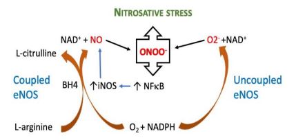 In recent years, much interest has been generated by the idea that nitrosative stress plays a role in the aetiology of human diseases, such as atherosclerosis, inflammation, cancer, and neurological diseases. The chemical changes mediated by reactive nitrogen species (RNS) are detrimental to cell function, because they can cause nitration, which can alter the structures of cellular proteins, DNA, and lipids, and hence, impair their normal function. One of the most potent biological nitrosative agents is peroxynitrite (ONOO¯), which is produced when nitric oxide (*NO) and superoxide (*O2¯) are combined at extremely rapid rates. Considering the plethora of oxidations by peroxynitrite, this makes peroxynitrite the most prevalent nitrating species responsible for protein, DNA, and lipids nitration in vivo. There is biochemical evidence to suggest that the interactions of the radicals NO and superoxide result in the formation of a redox system, which includes the reactions of nitrosation and nitration, and is a component of the complex cellular signalling network. However, the chemistry involved in the nitration process with peroxynitrite derivatives is poorly understood, particularly for biological molecules, such as DNA, proteins, and lipids. Here, we review the processes involved in the nitration of biomolecules, and provide a mechanistic explanation for the chemical reactions of NOS and nitrosative stress. This study reveals that these processes are based on a surprisingly simple and straightforward chemistry, with a fascinating influence on cellular physiology and pathology.