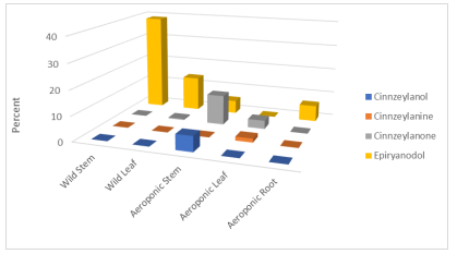 In this work, we have investigated the accumulation of ryanoids in different plant parts (leaves, stems and roots) of aeroponically grown Persea indica cloned trees (one-year-old cloned individuals) and a selected mature, wild tree. We tested the insect antifeedant (against Spodoptera littoralis, Myzus persicae and Rhopalosiphum padi) and nematicidal (against Meloidogyne javanica) effects of ethanolic extracts from these different plant parts. The HPLC-MS analysis of P. indica extracts showed that mature tree (wild) leaves had two times more chemical diversity than stems. Aeroponic plants showed fewer differences in chemical diversity between leaves and stems, with the lowest diversity found in the roots. Ryanodane epiryanodol (1) was present in all the plant parts, with the mature stems (wild) containing the highest amount. The aeroponic stems also accumulated ryanoids including 1, cinnzeylanol (2) and cinnzeylanone (4). The insect Spodoptera littoralis was strongly affected by the stem extracts, while leaf extracts were moderately active. Based on predicted vs. real antifeedant values, we concluded that the ryanoid content (1 or a combination of 2, 4 and 1) explained the antifeedant effects of the stem extracts, while additional components contributed to the activity of the leaf extracts. Therefore, careful individual selection of P. indica seedlings should be carried out prior to proceeding with aeroponic cultivation in order to obtain ryanodane-rich stem or leaf extracts with strong antifeedant effects on S. littoralis.