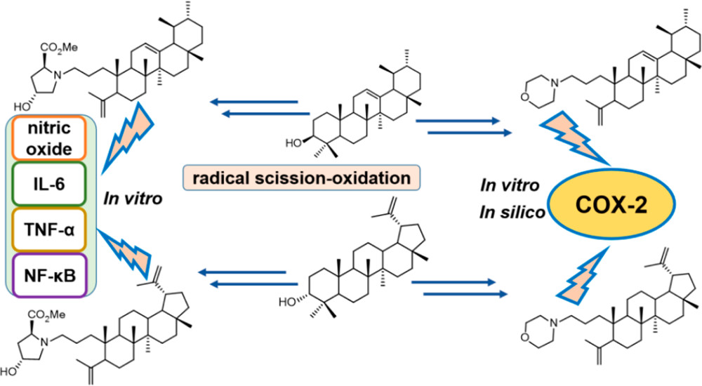 In this study, a series of novel 3-seco-A derivatives of the natural triterpenes α-amyrin (1) and 3-epilupeol (2) were synthesized by a one-pot radical scission–oxidation procedure and evaluated in vitro and in vivo for their capacity to inhibit the inflammatory process. For the in vitro studies, the trans-4-hydroxy-l-proline methyl ester derivatives (1f and 2f) were consistently effective in inhibiting NO, IL-6, and TNF-α secretion, as well as inhibition of NF-κB activation, in RAW cells stimulated by LPS. The further in vivo anti-inflammatory study revealed that the trans-4-hydroxy-l-proline methyl ester derivatives (1f and 2f), together with 1g, were the most effective in inhibiting TPA-induced edema. Interestingly, the α-amyrin derivatives were the most potent inhibitors of COX-2, but inhibited COX-1 only to some extent. The hydroxyl derivative (1c) was selective for COX-2 inhibition (66.3 ± 1.1% at 17.5 μM) without affecting the COX-1 isoform and did not present toxicity. Molecular docking studies revealed that these compounds bind with their polar region in the cavity over Arg-120, and their lipophilic part is orientated to the HEM cofactor similarly to the natural substrate arachidonic acid in the catalytic site of COX-2. These results indicated that seco-A ursane derivatives could be considered promising candidates for the future development of selective NF-κB and COX-2 inhibitors.