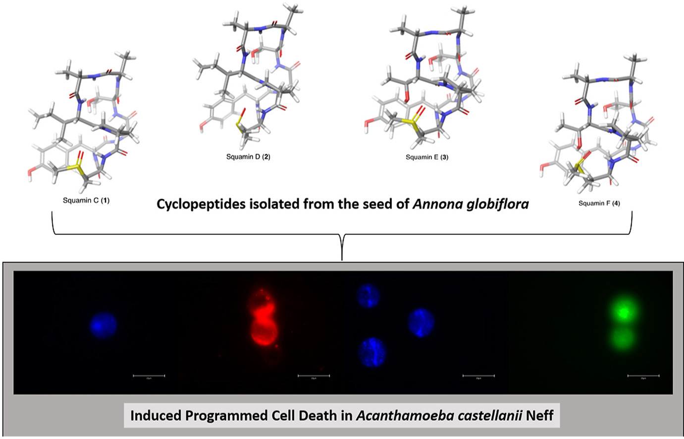 Free-living amoebae of Acanthamoeba spp. are causative agents of human infections such as granulomatous amoebic encephalitis (GAE) and Acanthamoeba keratitis (AK). The exploration of innovative chemical entities from natural sources that induce intrinsic apoptotic pathway or a Programmed Cell Death (PCD) in Acanthamoeba protozoa is essential to develop new therapeutic strategies. In this work, the antiamoeboid activity of squamins C–F (1–4), four cyclooctapeptides isolated from Annona globiflora was tested in vitro against Acanthamoeba castellanii Neff, A. polyphaga, A. quina, and A. griffini, and a structure–activity relationship was also established. The most sensitive strain against all tested cyclooctapeptides was A. castellanii Neff being the R conformers of the S-oxo-methionine residue, squamins D (2) and F (4), the most active against the trophozoite stage. It is remarkable that all four peptides showed no cytotoxic effects against murine macrophages cell line J774A.1. The analysis of the mode of action of squamins C–F against A. castellanii indicate that these cyclopeptides induced the mechanisms of programmed cell death (PCD). All peptides trigger mitochondrial damages, significant inhibition of ATP production compared to the negative control, chromatin condensation and slight damages in membrane that affects its permeability despite it conserves integrity at the IC90 for 24 h. An increase in reactive oxygen species (ROS) was observed in all cases.