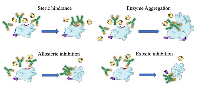Antibodies have transformed biomedical research and are now being used for different experimental applications. Generally, the interaction of enzymes with their specific antibodies can lead to a reduction in their enzymatic activity. The effect of the antibody is dependent on its narrow i.e. the regions of the enzyme to which it is directed. The mechanism of this inhibition is rarely a direct combination of the antibodies with the catalytic site, but is rather due to steric hindrance, barring the substrate access to the active site. In several systems, however, the interaction with the antibody induces conformational changes on the enzyme that can either inhibit or enhance its catalytic activity. The extent of enzyme inhibition or enhancement is, therefore, a reflection of the nature and distribution of the various antigenic determinants on the enzyme molecule. Currently, the mode of action of many enzymes has been elucidated at the molecular level. We here review the molecular mechanisms and recent trends by which antibodies inhibit the catalytic activity of enzymes and provide examples of how specific antibodies can be useful for the neutralization of biologically active molecules.