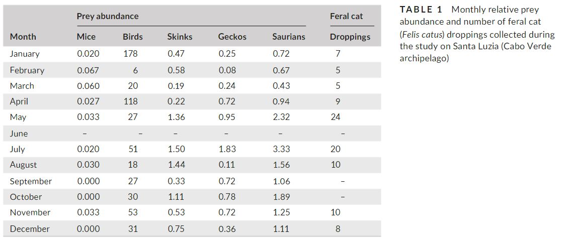 Studies on feral cat diet offer important ecological information and are the first step towards determining their impact upon endangered species. However, in comparing seasonal changes in diet with seasonal prey availability, the scarce amount of research into oceanic islands worldwide must be considered when deciding if a specific population is actually affected by cat predation. Cat diet was analysed on Santa Luzia (Cabo Verde Islands) since this invasive predator is considered one of the main threats to native endangered species that require conservation measures. These previous studies were carried out in different seasons, providing contrasting results, skinks being more preyed upon in the rainy season and mice in the driest periods. To check these different results, we focussed on how cat diet varied seasonally in response to changes in prey abundance. Saurians were the most important prey group, followed by mice, invertebrates and birds. No seasonal differences were, however, observed in the different prey groups consumed, saurians being the main prey in both seasons. All cases reflected their respective abundances. Results corroborate the generalist and opportunistic trophic ecology of feral cats, providing important information to assess their impact on prey populations and design future eradication programmes.