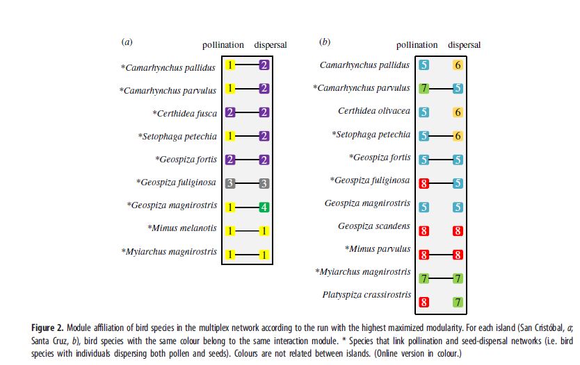 Many vertebrate species act as both plant pollinators and seed-dispersers, thus interconnecting these processes, particularly on islands. Ecological multilayer networks are a powerful tool to explore interdependencies between processes; however, quantifying the links between species engaging in different types of interactions (i.e. inter-layer edges) remains a great challenge. Here, we empirically measured inter-layer edge weights by quantifying the role of individually marked birds as both pollinators and seed-dispersers of Galápagos plant species over an entire year. Although most species (80%) engaged in both functions, we show that only a small proportion of individuals actually linked the two processes, highlighting the need to further consider intra-specific variability in individuals' functional roles. Furthermore, we found a high variation among species in linking both processes, i.e. some species contribute more than others to the modular organization of the multilayer network. Small and abundant species are particularly important for the cohesion of pollinator seed-dispersal networks, demonstrating the interplay between species traits and neutral processes structuring natural communities.