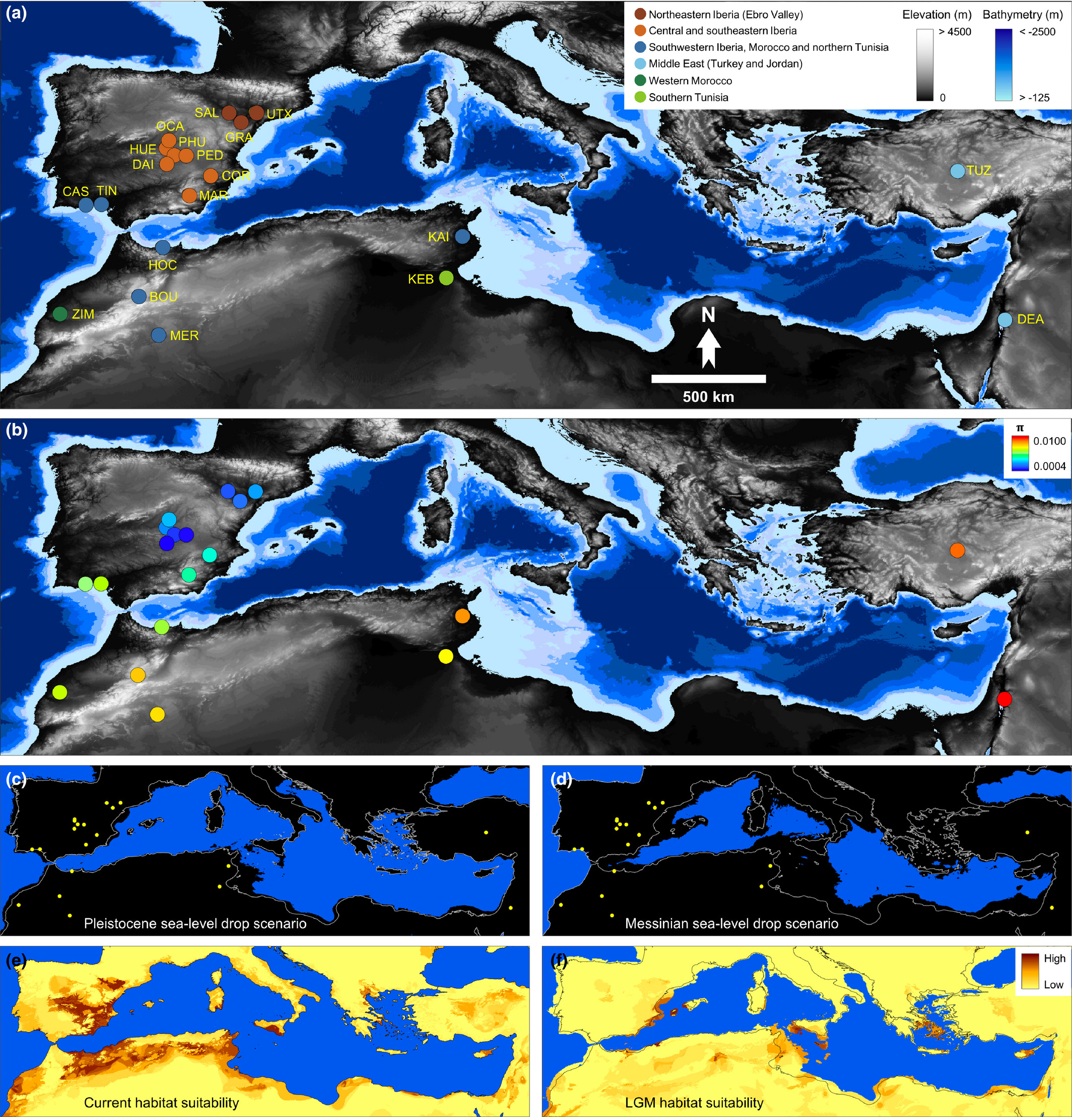 Phylogenomic analyses reveal the presence of two North African cryptic lineages and support that trans‐Mediterranean populations of the species diverged in the Pleistocene, with evidence of post‐Messinian permeability of the Strait of Gibraltar to gene flow likely associated with sea level drops during glacial periods. Accordingly, spatial patterns of genetic differentiation are best explained by a scenario of population connectivity defined by the configuration of emerged landmasses and environmentally suitable habitats during glacial periods, a time when effective population sizes of the species peaked as inferred by genomic‐based demographic reconstructions.