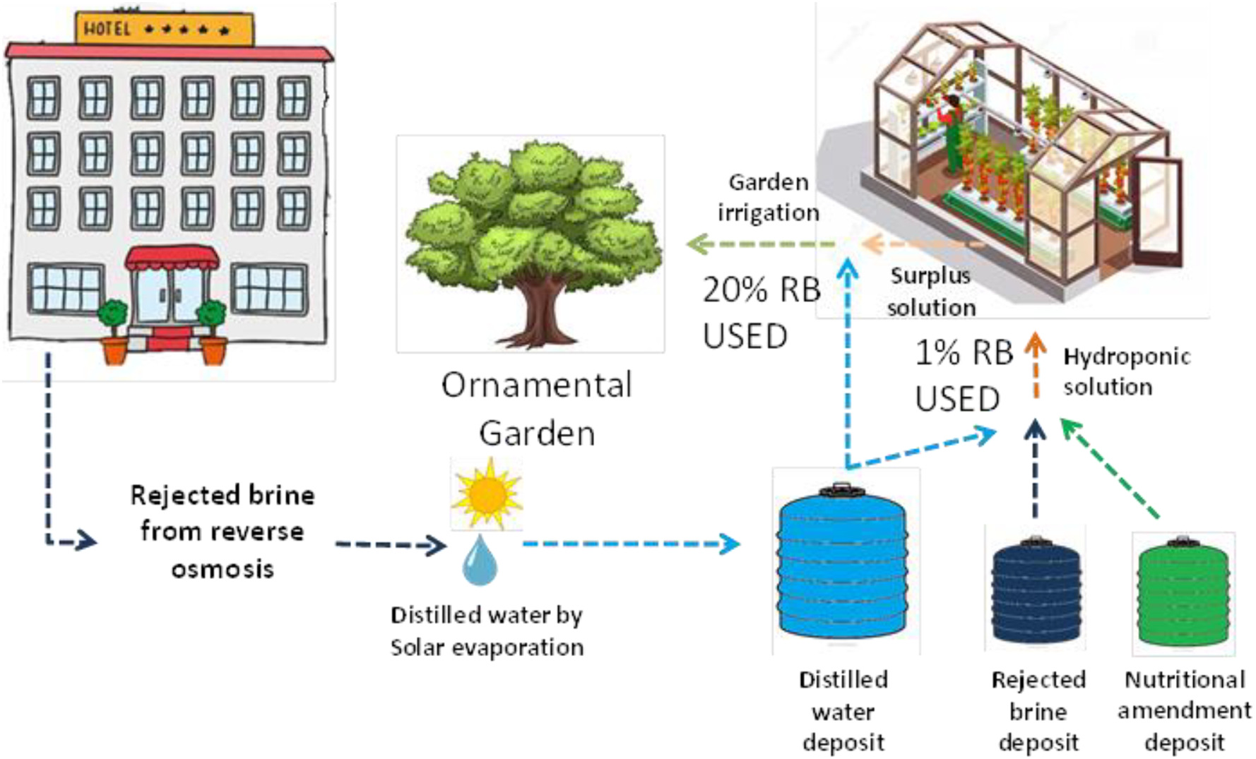For >50 years the Canary Islands have been using seawater desalinization facilities in order to satisfy the freshwater demand of their main economic activity –tourism, which continues to contribute to the economic and social progress of the archipelago. However, this desalinization process involves the production of a “waste” product known as rejected brine, which is discharged from coastal regions and islands, whether it originates from public or private facilities. Rejected brines are potentially a serious threat to marine ecosystems. However, here we demonstrate that this “waste” can be processed and reused as a nutrient mineral solution for a hydroponic production system and also a source of freshwater. The efficiency of this management process in terms of fresh-water production and water recycling economy is also discussed. The aim of this paper is to change the attitude towards rejected brines, which should be treated as potential raw material to permit high savings in the running costs of leisure and tourist facilities around the archipelago. In addition, this will also have a positive effect on the environment, making desalinization more sustainable and environmentally friendly, which is nowadays an added value in customer and user satisfaction.