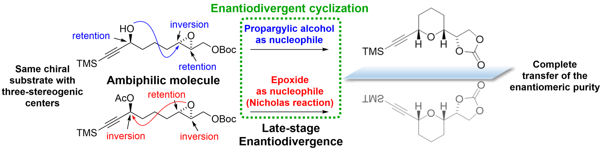 Inverting the reactivity of the functional groups in ambiphilic molecules provides a new synthetic strategy to carry out late‐stage enantiodivergence. Both enantiomers of the final compound can be obtained from a common chiral precursor. As a proof of concept, the synthesis of substituted five‐ and six‐membered oxacycles is described. The key step is the cyclization of an ambiphilic linear precursor bearing a propargylic alcohol and an epoxide linked through an alkyl chain. Through a slight modification of these linear precursors and employing different reaction conditions, these functional groups can inverse their chemical reactivity, producing one enantiomer or another of the final product. This enantiodivergent cyclization involves three stereogenic centers that can undergo fully controlled retention or inversion of their configuration depending on the cyclization pathway that is activated. The cyclization provides late‐stage enantiodivergence, enabling the synthesis of either enantiomers of the oxacycles from a common chiral substrate with total transfer of the enantiomeric purity.