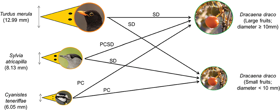 Despite being abundant in urban gardens, the Canary Islands dragon tree Dracaena draco is close to extinction in the wild. It tends to produce relatively large fruits, which limits the pool of vertebrates that might disperse its seeds. We aimed to shed light on the seed dispersal system of this plant by studying its fruit size in relation to the feeding behavior of its present dispersers, and to discuss on possible differences with the past dispersal system, when large-sized dispersers were abundant. Besides fruit and seed characterization, we performed experiments on seedling emergence (using the characterized seeds), and field observations of the fruit handling behavior of frugivorous birds. Seed removal by granivores beneath and outside the dragon tree canopies was assessed through a field experiment. An additional seedling emergence experiment tested the effect of pulp removal from around the seed (using seeds contained within the fruits and manually depulped seeds). A feeding experiment was carried out with captive individuals of the Canary endemic white-tailed pigeon Columba junoniae-a large frugivore that occasionally consumes D. draco fruits-to test if its gut treatment influences seed viability. Small fruits produced seeds unable to germinate, while most seedling emergence was recorded only for seeds from large fruits. Our observations suggest that the only passerine species able to swallow large fruits is the medium-size passerine Turdus merula, whereas small passerines tended to pluck the pulp without aiding seed dispersal. Nonetheless, Sylvia atricapilla-the largest among the group of small passerines-occasionally transported fruits away from parent plants to consume the pulp, resulting in seed dispersal without any digestive treatment. This behavior indicates S. atricapilla might be occasionally a legitimate disperser of D. draco, since our experiments suggest that seed transport away from parent trees and pulp removal enhance both post-dispersal seed survival and seedling emergence. Lastly, the pigeons used in the experiment regurgitated mostly viable seeds, suggesting the legitimacy of C. junoniae as seed disperser for D. draco. Therefore, although D. draco likely had more seed dispersers in the past, we identified at least two bird species that can still disperse its seeds nowadays.