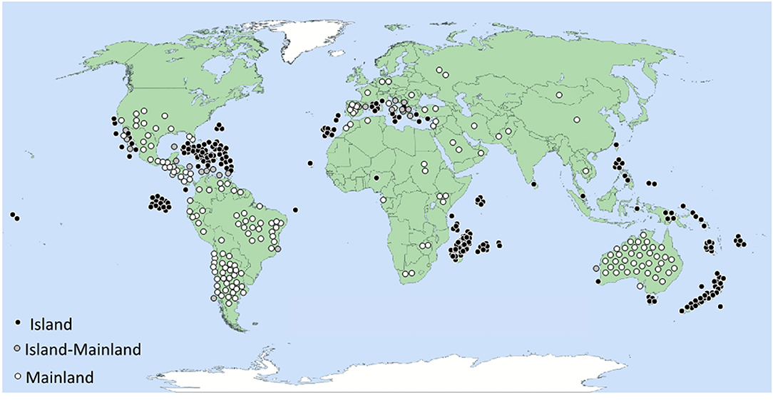 Birds and mammals are the only vertebrates which receive comprehensive attention in studies of dispersal of fleshy-fruited plant species. However, recently the importance of fleshy fruit in the diet of lizards (order Squamata: suborder Sauria), and their role as seed dispersers have been recognized in a number of studies, especially in studies from arthropod-poor habitats, such as oceanic islands. Here, we revisit the evidence of fruit-eating lizards on a global scale in order to test if fruit consumption is more common on islands than expected by chance. We constructed a database of 470 lizard species (from a global count of 6,515 species), that have been reported to consume fleshy fruits. This set of lizards belong to 27 families with Scincidae (N = 78 species), Gekkonidae (69), and Dactyloidae (55) having more frugivorous species than other lizard families. We found that 62.4% of these lizards inhabit islands, whereas only one third (35.3%) of all lizard species inhabit islands. These values support the presence of an >insular phenomenon,> however; we also tested if this biogeographical pattern might be driven by body size and evolutionary history of lizards. Thus, we looked for any phylogenetic signals in the distributions of lizard body size, island-presence, and frugivory and calculated phylogenetically corrected correlations among the three variables on a global subset of 2,417 lizard species for which we had detailed phylogenetic information. Both lizard body size and island-presence were weakly influenced by phylogeny; whereas, frugivory was not. In addition, we found that (1) body size and frugivory were weakly positively correlated; (2) body size and island-presence were uncorrelated; and (3) island-presence and frugivory were strongly positively correlated. Thus, we conclude that the main driver of frugivory on islands is the specific island environment and not lizard body size per se. Islands are said to be poor in arthropods and predators, and this may force/allow island lizards to forage for additional food sources, such as fleshy fruits. We also suggest that modern lizards as well as their ancestors may potentially play an important role to many plants as seed dispersers. However, we do not known how tight the correlation is between frugivory and seed dispersal. Thus, lizards repeatedly inspire us to ask new ecological and evolutionary questions.
