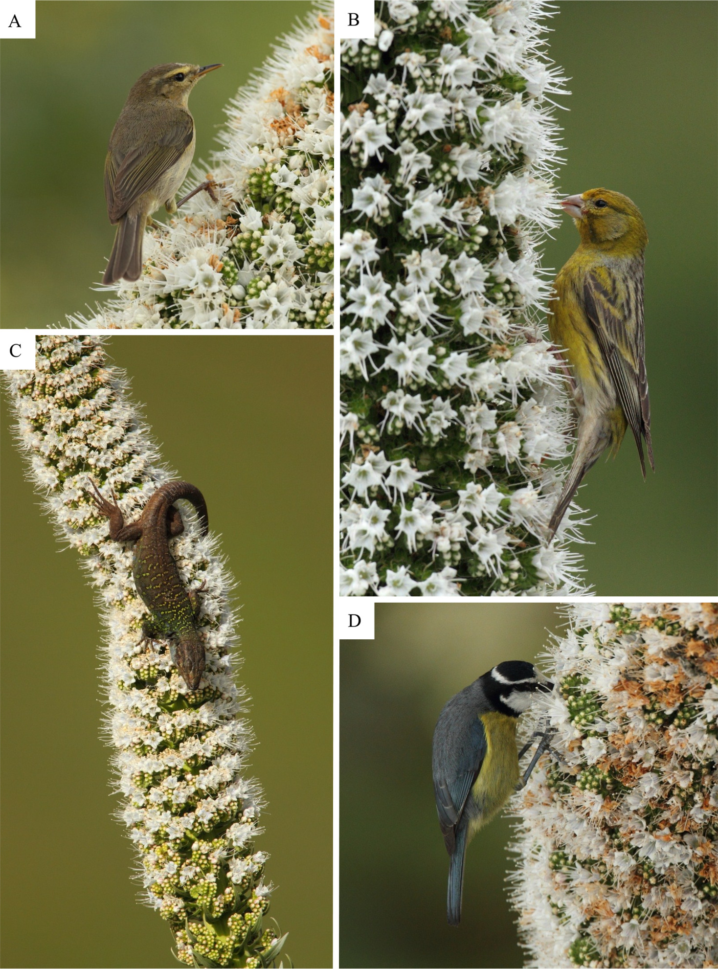 Oceanic island ecosystems favour the appearance of novel interactions as a consequence of their depauperate and disharmonic flora and fauna. We investigated Echium simplex, endemic to the Anaga Biosphere Reserve in NE Tenerife, Canary Islands, belongs to the Canarian bird–flower element. Along two flowering seasons, we studied the breeding system of E. simplex, identified the floral visitors and compared the pollination effectiveness of different animal guilds (insects versus vertebrates) by means of selective exclosures. E. simplex is self-compatible but selfing significantly reduced fruit set. The flowers were visited by five bird species (mostly Phylloscopus canariensis and Serinus canarius, but also Cyanistes teneriffae, Sylvia atricapilla and Sylvia melanocephala), a lizard species (Gallotia galloti) and over a hundred insect species (mainly hymenopterans and coleopterans). Flying insects increased fruit set whereas small flower dwellers (mostly beetles) decreased both fruit and seed set. Vertebrates had a negligible effect on reproductive success. We conclude that although the floral resources provided by E. simplex may be important to some vertebrate species, these do not appear to contribute to increase fitness of the plant, which was more dependent upon flying insects for fruit and seed set. We additionally found that plant reproductive structures are heavily damaged by feral goats, which threaten the maintenance of this Canarian endemic species.