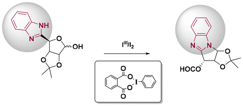 The synthesis of benzimidazole-fused iminosugars through a tandem β-fragmentation-intramolecular cyclization reaction is described. The use of the benzimidazole ring as the internal nucleophile and the use of phenyliodosophthalate (PhI(Phth)), a new metal-free and low toxic hypervalent iodine reagent, are the most remarkable novelties of this synthetic strategy. With this approach, we have demonstrated the usefulness of the fragmentation of anomeric alkoxyl radicals promoted by the PhI(Phth)/I system for the preparation of new compounds with potential interest for both medicinal and synthetic chemists.