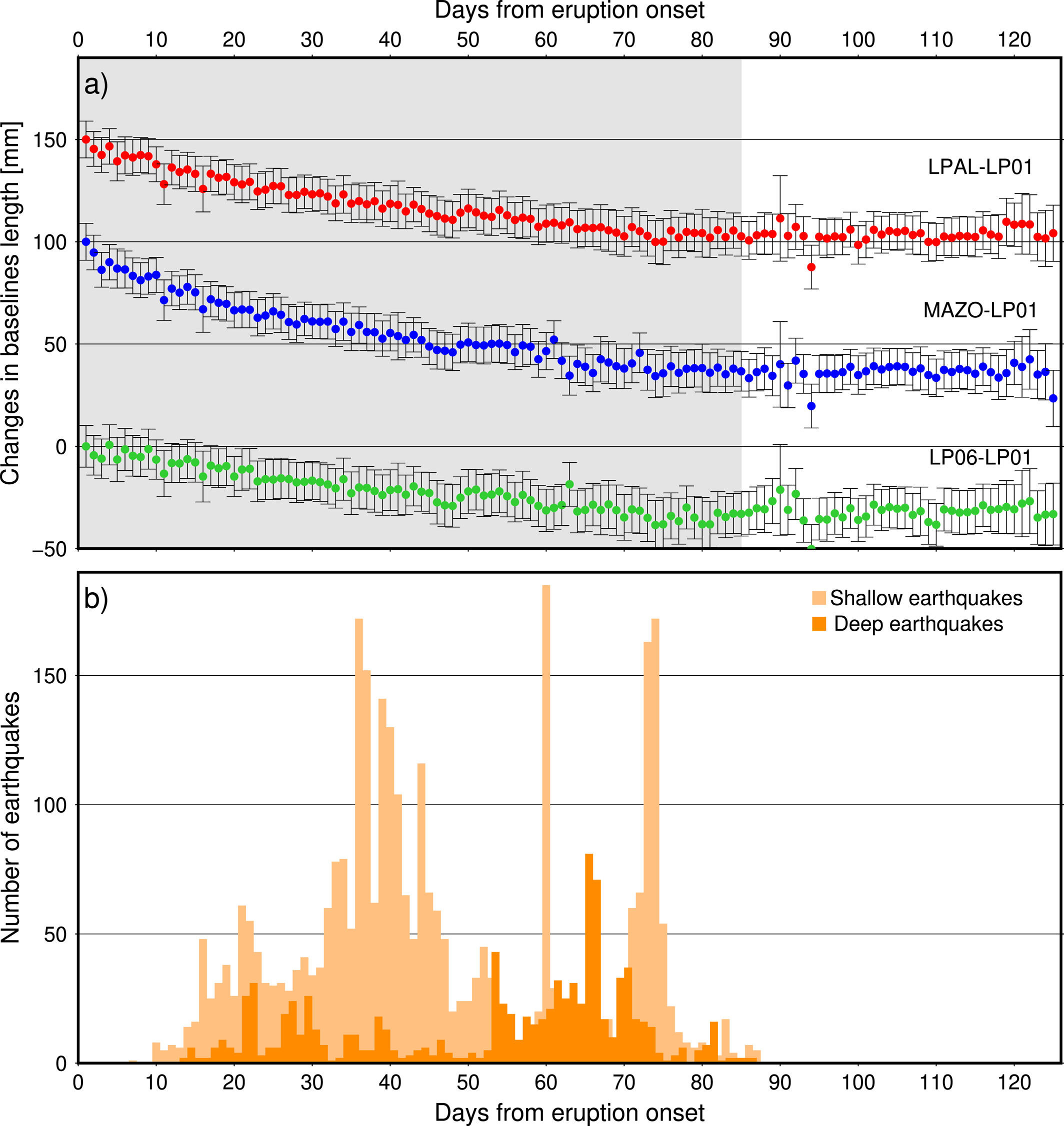 Forecast of eruptive activity is a core challenge in volcanology. Here, we present an actual forecast for the end of the 2021 La Palma eruption. Using continuous GNSS data, we identified a co-eruptive quasi-exponential deflation trend. Assuming mass conservation, magma upflow from an overpressurized reservoir drives the eruptive process. The forecast was carried out during the eruption, however there was uncertainty in the key percentage of drop in driving pressure necessary to stop this eruption. In hindcast, we explore how forecast uncertainty reduces with increase in ingested near-real time data. We conclude that precise forecasts could have been possible, but only after twice a characteristic exponential decay time-scale, providing error estimates of 45% of the actual duration. We verify the mass conservation assumption using eruptive material volumes and propose that the eruption dynamics was controlled by a main reservoir at a depth close to Moho discontinuity beneath Cumbre Vieja volcano.