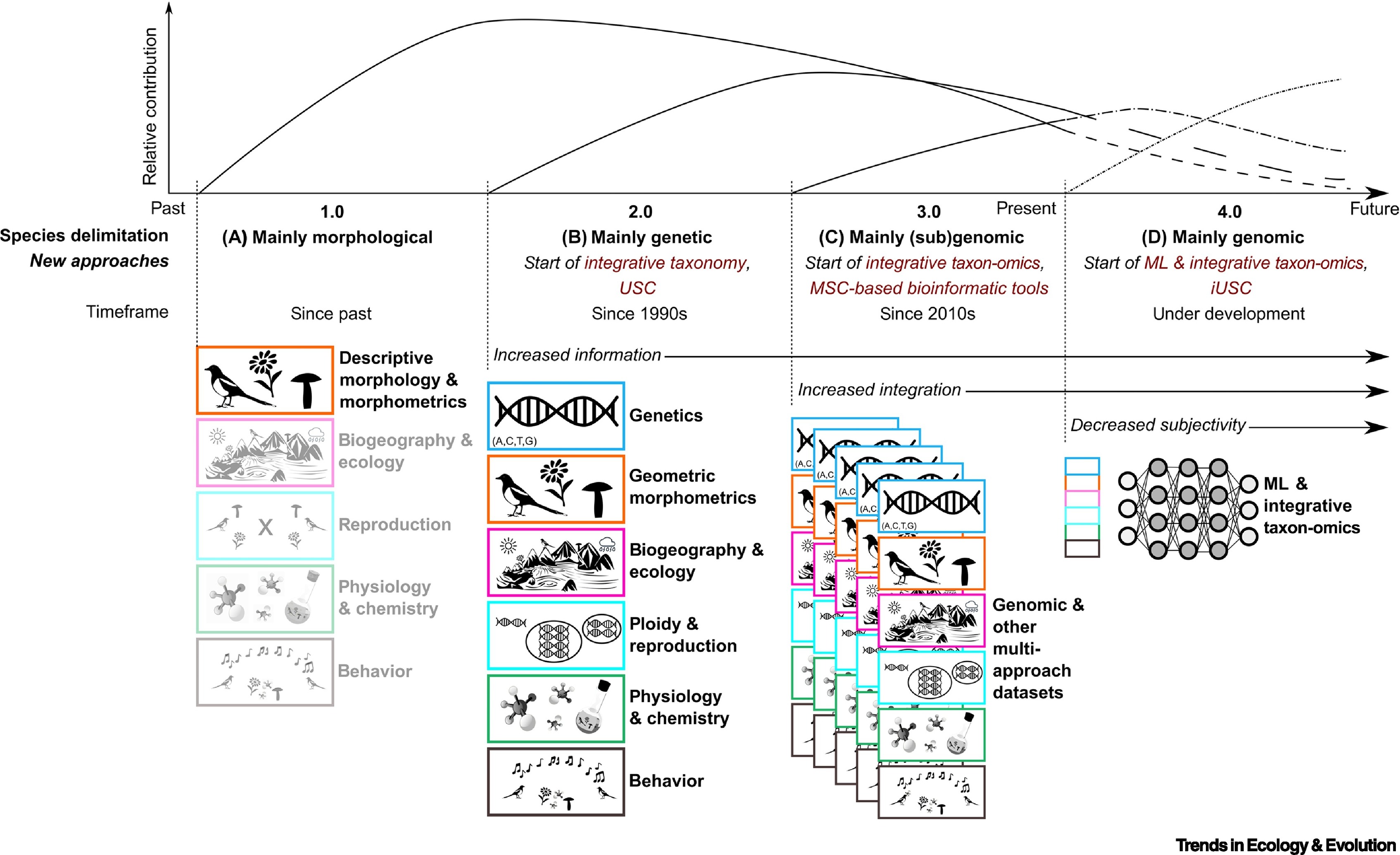Although species are central units for biological research, recent findings in genomics are raising awareness that what we call species can be ill-founded entities due to solely morphology-based, regional species descriptions. This particularly applies to groups characterized by intricate evolutionary processes such as hybridization, polyploidy, or asexuality. Here, challenges of current integrative taxonomy (genetics/genomics + morphology + ecology, etc.) become apparent: different favored species concepts, lack of universal characters/markers, missing appropriate analytical tools for intricate evolutionary processes, and highly subjective ranking and fusion of datasets. Now, integrative taxonomy combined with artificial intelligence under a unified species concept can enable automated feature learning and data integration, and thus reduce subjectivity in species delimitation. This approach will likely accelerate revising and unraveling eukaryotic biodiversity.