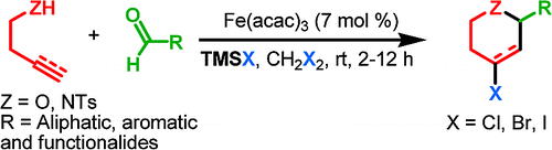 A new Prins cyclization process that builds up one carbon−carbon bond, one heteroatom-carbon bond, and one halogen-carbon bond, (in an oxa- and azacycle) relies on an iron catalyst system formed from Fe(acac)3 and trimethylsilyl halide. The method displays a broad substrate scope and is economical, environmentally friendly, and experimentally simple. This catalytic method permits the construction of chloro, bromo and iodo heterocycles, by the suitable combination of iron(III) source, the corresponding trimethylsilyl halide and the solvent, in high yields.